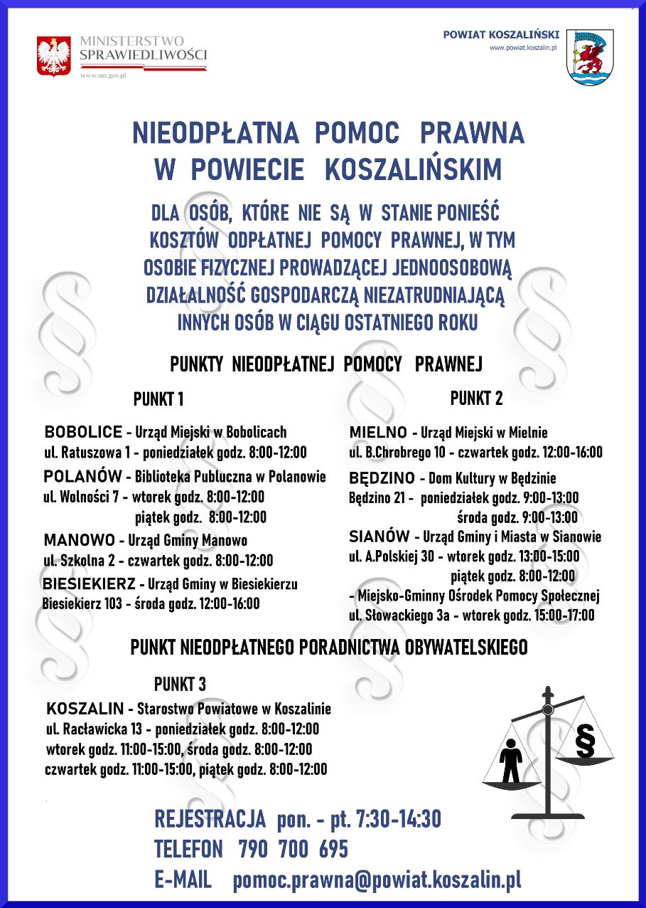 Wykaz punktów, w których udzielana będzie nieodpłatna pomoc prawna lub świadczone nieodpłatne poradnictwo obywatelskie na terenie powiatu koszalińskiego w roku 2020